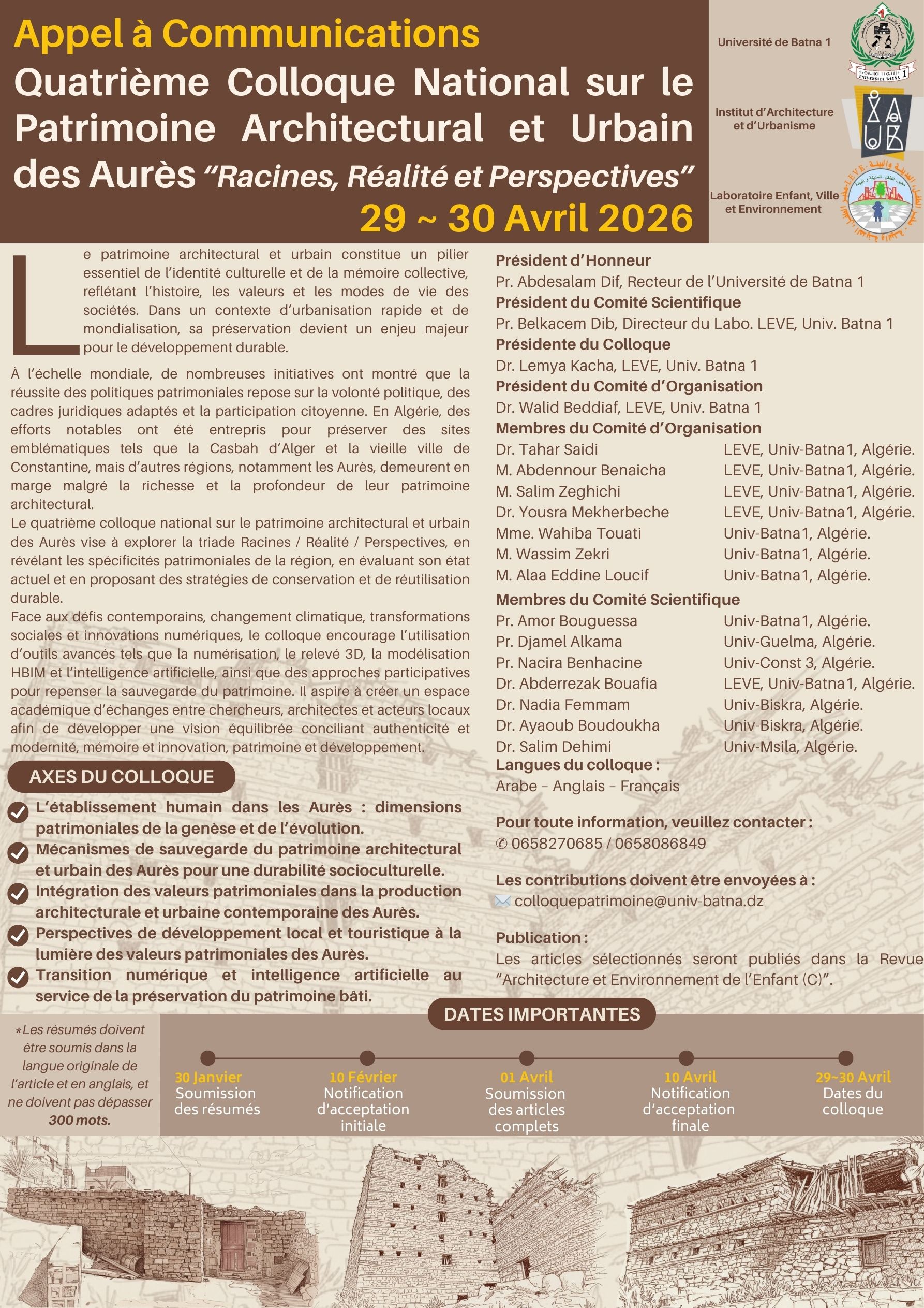 Quatrième Colloque National sur le Patrimoine Architectural et Urbain des Aurès « Racines, Réalité et Perspectives »